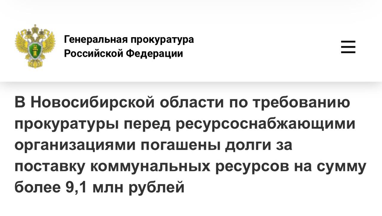 В Новосибирской области по требованию прокуратуры перед ресурсоснабжающими организациями погашены долги за поставку коммунальных ресурсов на сумму более 9,1 млн рублей