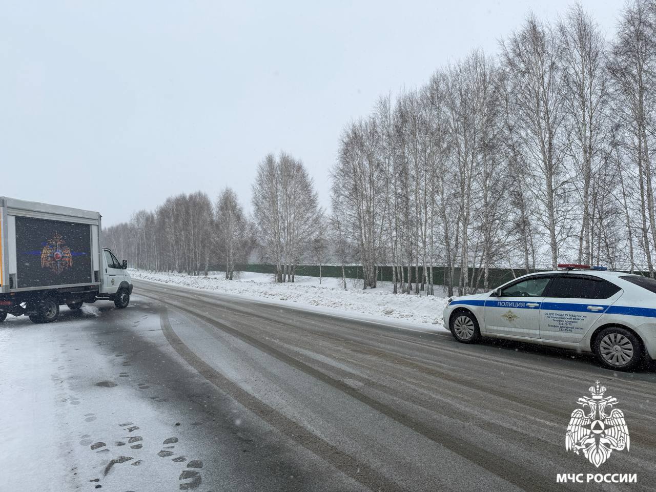 По сценарию, снегопады спровоцировали ДТП у станции Мочище: столкнулись автобус и грузовой автомобиль. В результате условно — 14 пострадавших, 2 погибших и пробка; один автомобиль загорелся из-за перегрева.