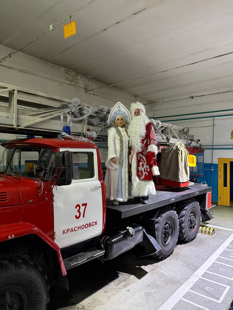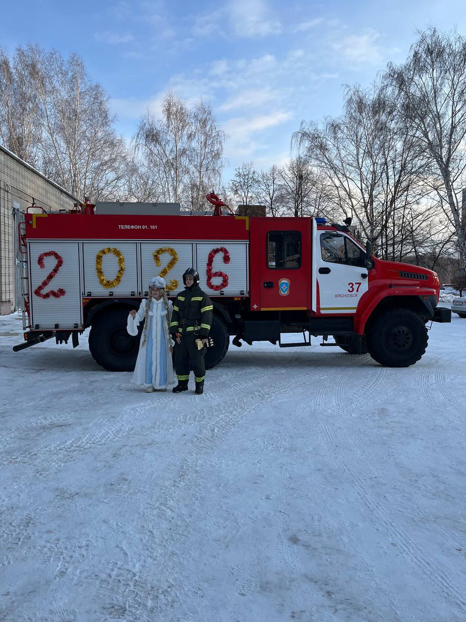 Пожарный в костюме Деда Мороза и Снегурочка прибыли на красной машине. Дети с восторгом наблюдали за праздником из окон. Творческий коллектив школы показал танцевальный номер, мама одного из учеников спела песню. Дед Мороз поднялся на автолестнице к окнам, поздравил ребят и пожелал здоровья.