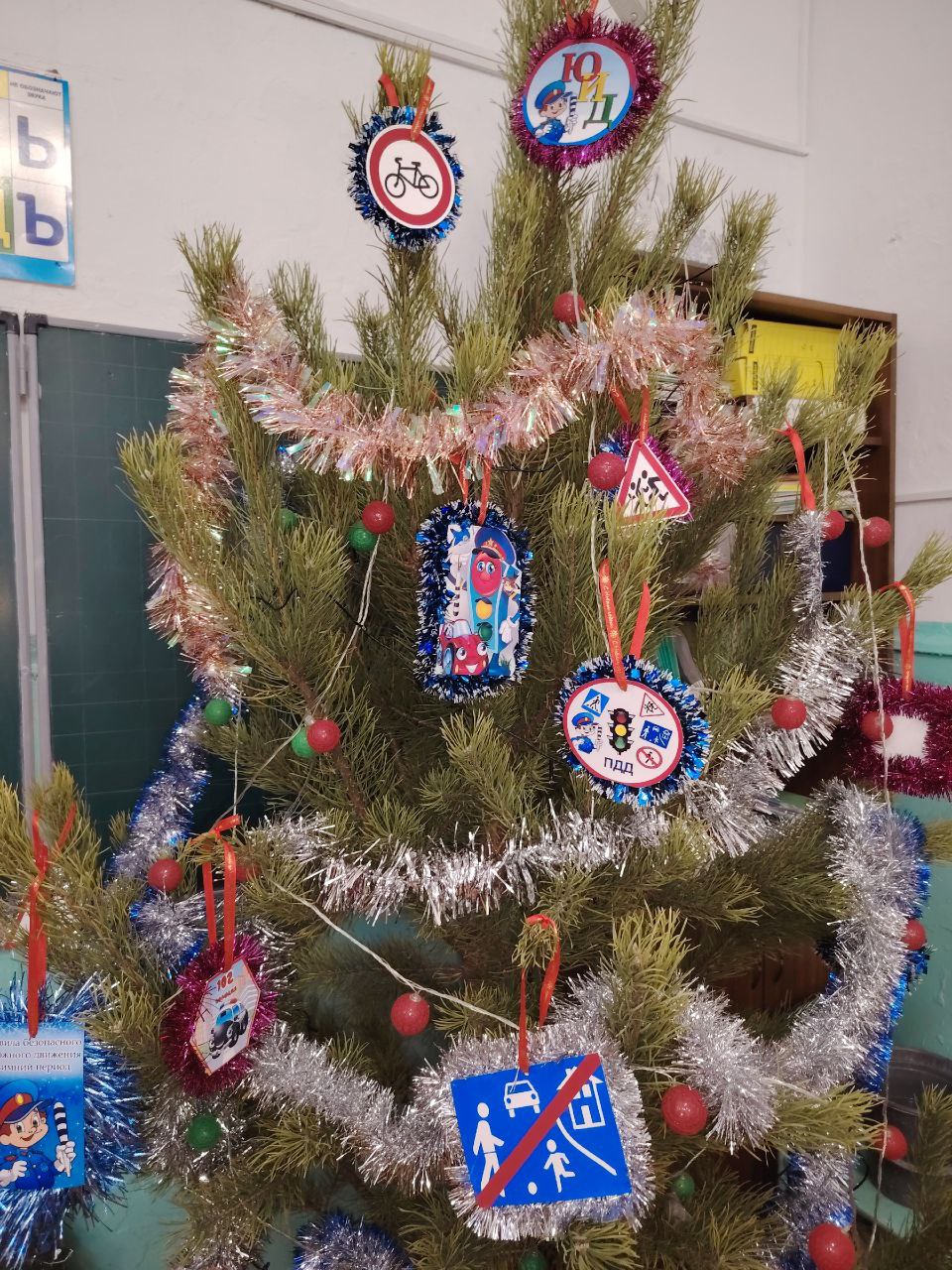 Дети рассказали Деду Морозу и Снегурочке о том как надо переходить дорогу; вспомнили о дорожных ловушках, перечислили особенности поведения на зимней дороге, рассказали о значении дорожных знаков и украсили ими елку.
