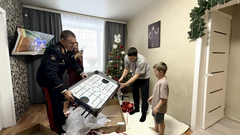 Богдан вместе с членами своей семьи и гостем принялся открывать сюрприз, стараясь скорее посмотреть что же внутри яркой коробки. Наконец открыв подарок, лицо ребенка наполнилось счастьем, это был долгожданный настольный хоккей, о котором давно мечтал ребенок. Не обошлось и без сладких гостинцев, которые ждут все дети в Новый год — вкусные лакомства от Константина Вячеславовича тоже оказались под елкой Богдана.