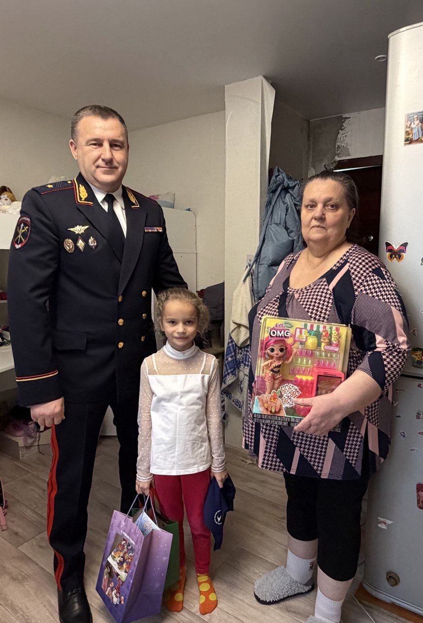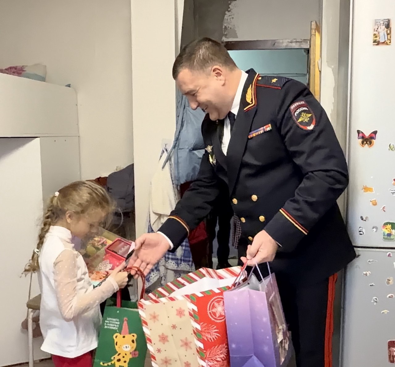 Получив пожелание, генерал — майор полиции Константин Вячеславович Гаврин не мог не исполнить новогоднее пожелание ребенка и, отложив все дела, прибыл с поздравлениями и подарками.