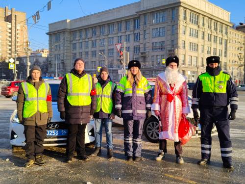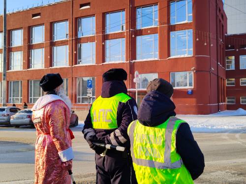 В преддверии новогодних праздников и зимних школьных каникул сотрудники Госавтоинспекции города Новосибирска, полицейский Дед Мороз и народные дружинники вышли на городскую площадь, чтобы поздравить участников дорожного движения с наступающим Новым годом.