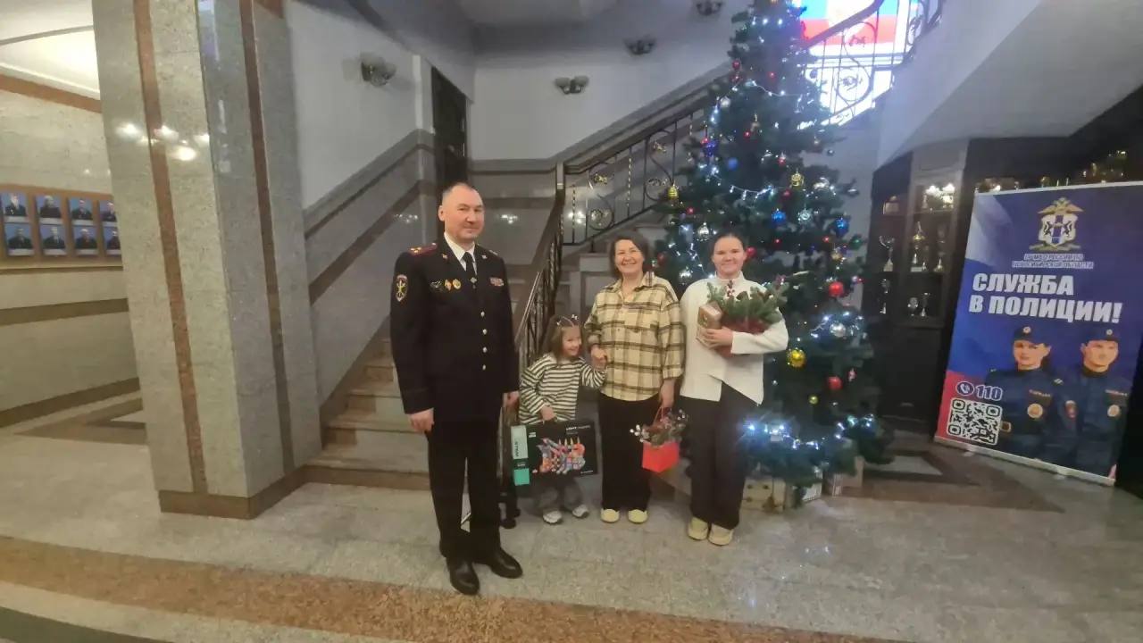 У празднично украшенной новогодней ели, расположенной в Главном управлении МВД России по Новосибирской области, Алексей Юрьевич подарил