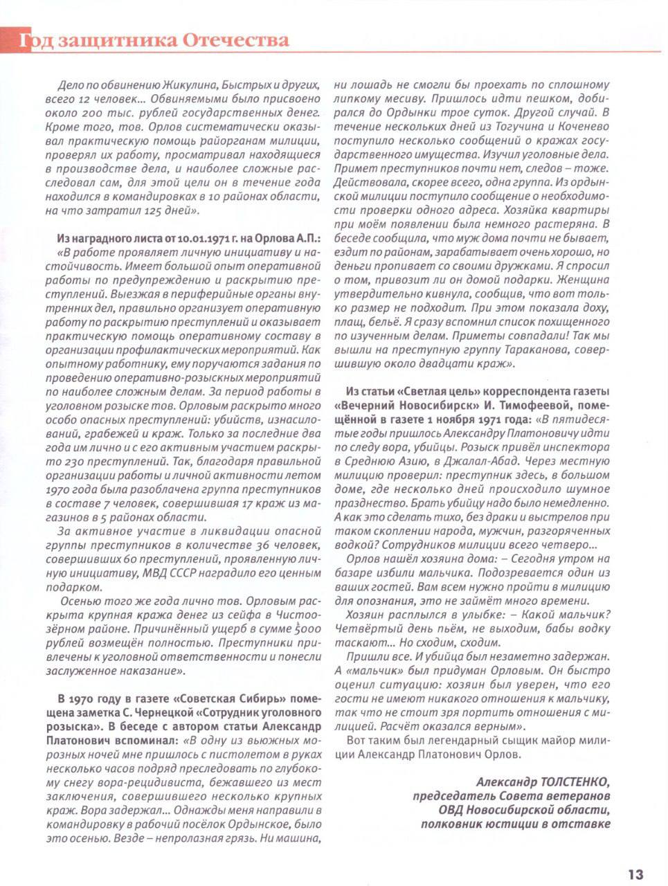 Статья посвящена 110-летию со дня рождения Александра Платоновича Орлова, легендарного оперативника и следователя новосибирской милиции.