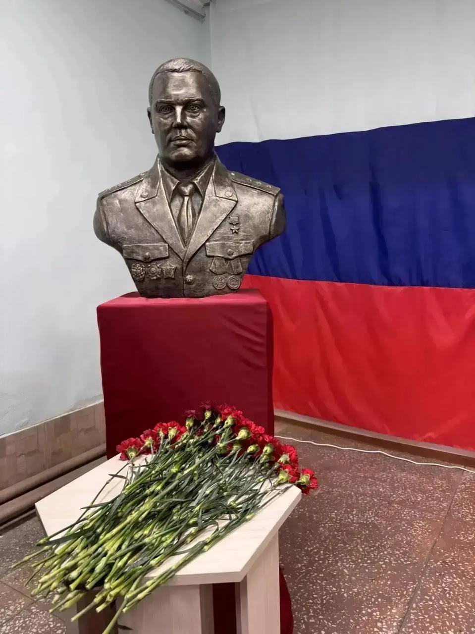 Затем глава Карасукского муниципального округа Вячеслав Кулаков и помощник оперативного дежурного МО МВД России «Карасукский» младший лейтенант полиции Евгений Отрешко открыли бюст Героя Российской Федерации Леонида Валентиновича Русских. После минуты молчания участники мероприятия возложили цветы к бюсту Героя Российской Федерации.