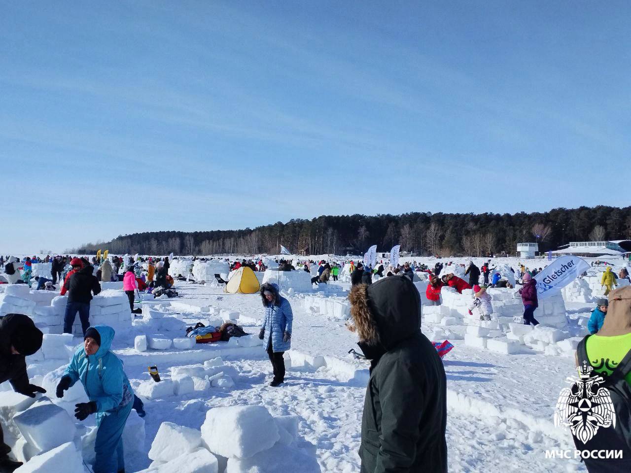 Новосибирцы строят хижины эскимосов на берегу Обского водохранилища под контролем спасателей