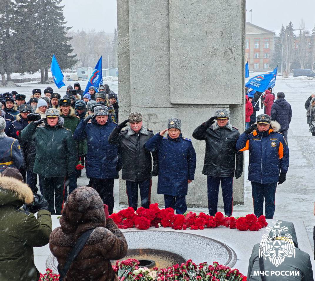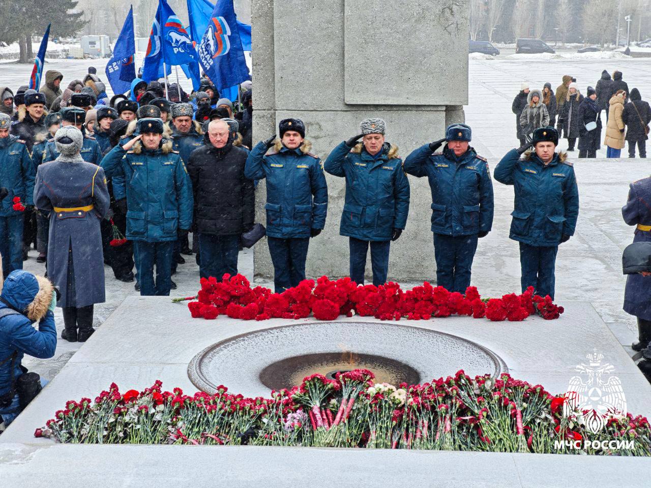 В честь Дня защитника Отечества сотрудники МЧС России возложили цветы к Вечному огню