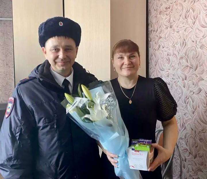 Заместитель начальника Межмуниципального отдела МВД России «Татарский» - начальник полиции майор полиции Дмитрий Михалев поздравил Алесю Лейб - супругу полицейского (кинолога) ИВС ОП «Усть-Таркское» старшины полиции Александра Лейбы, в семье которых воспитывается 6 детей.