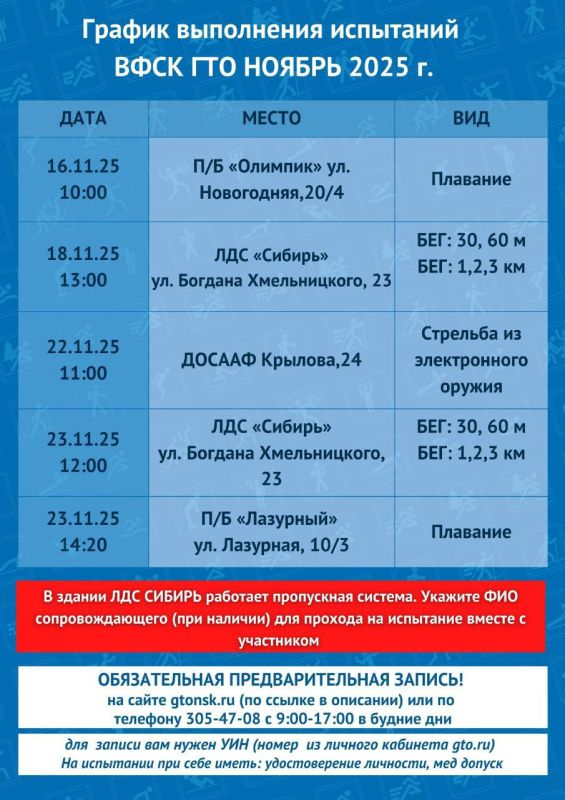 Нужна предварительная запись: по 305-47-08 с 9:00 до 18:00, с понедельника по пятницу.Участники должны указать УИН (номер из личного кабинета на сайте gto.ru), иметь при себе удостоверение личности и медицинский допуск.
