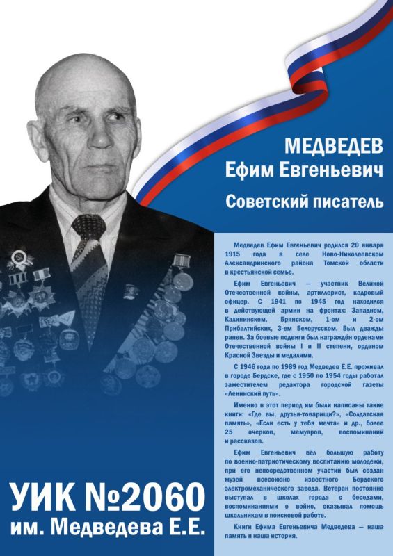 5 сентября в городе Бердске в торжественной обстановке избирательному участку №2060 присвоили имя Медведева Ефима Евгеньевича – советского писателя, коренного сибиряка. Избирательный участок находится в детской художественной школе «Весна». 1363...