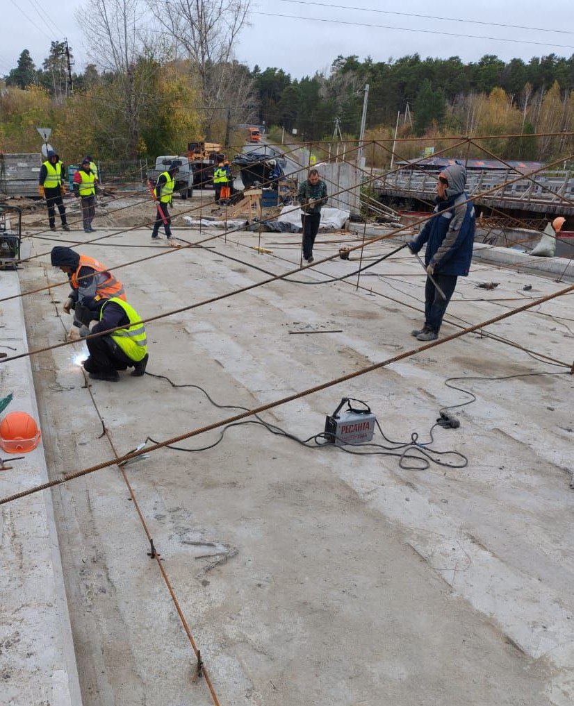 В настоящее время идёт подготовка к устройству выравнивающего слоя проезжей части моста и бетонированию переходных плит, которые соединят конструкцию с насыпью.