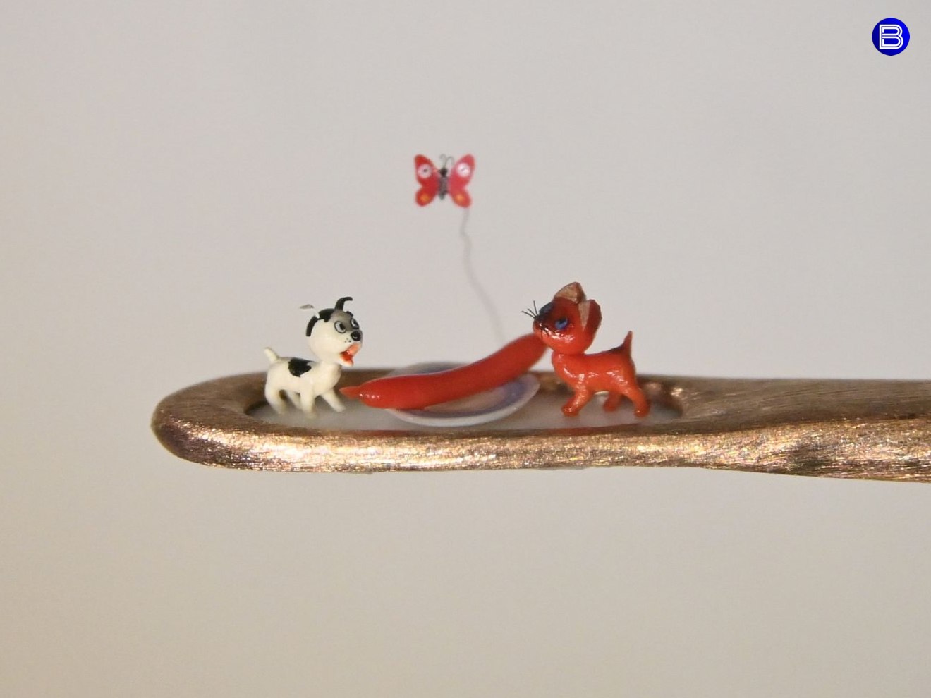 Композиция состоит из котёнка и щенка около сосиски на тарелке, над которой кружит бабочка. Она получилась ещё меньше – всего 0,4 миллиметра.