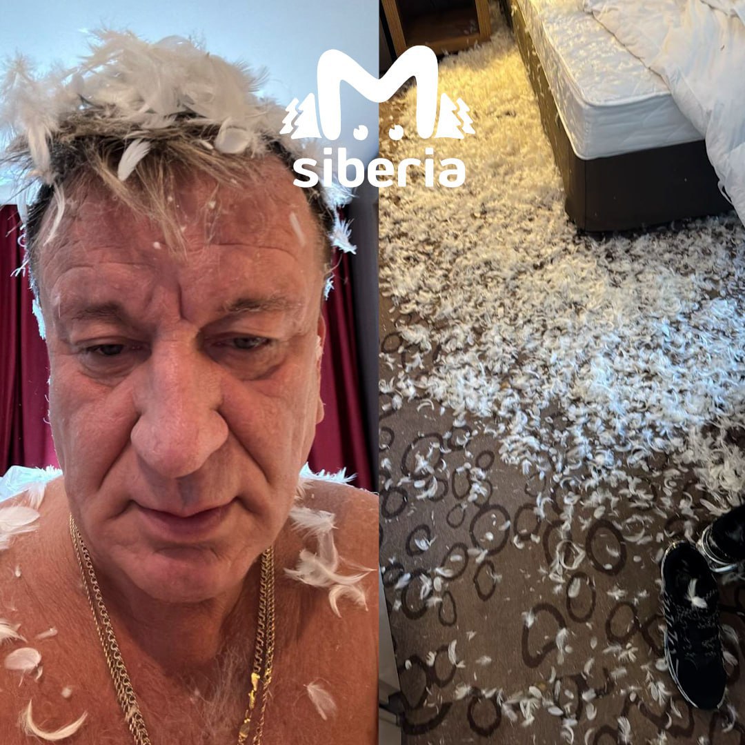 По словам певца, приехал в гостиницу уставший после концерта и просто уснул. Ничего не вытворял и неожиданно проснулся весь в перьях.