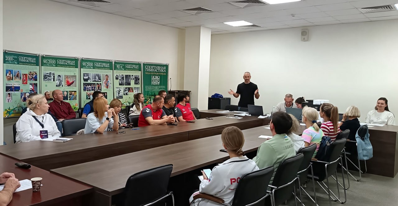 В Центре подготовки по спортивной гимнастике работала мандатная комиссия, а спортсмены тренировались по свободному графику. В конференц-зале организовано совещание представителей команд, тренеров и судейской коллегии — все нацелены на успешное проведение соревнований.