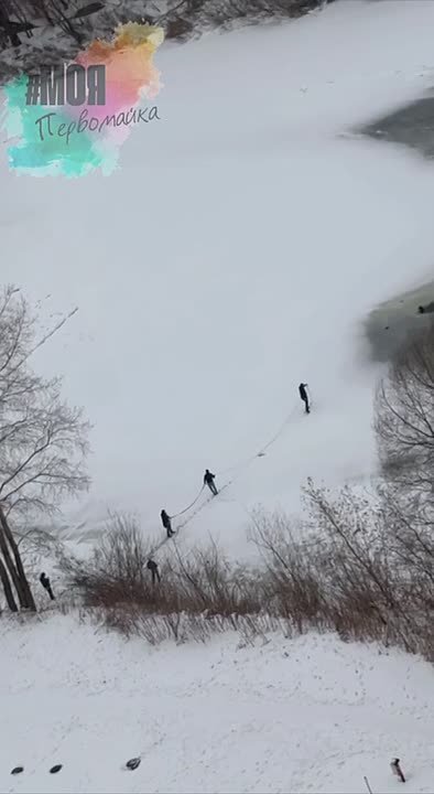 Мужчины, оперативно соорудившие длинную верёвку из подручных средств, вытянулись в цепочку и стали бросать карабин подростку, который смог ухватиться за край льдины.