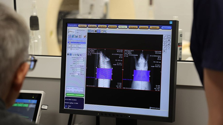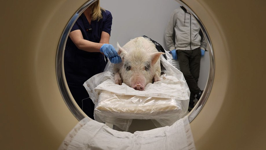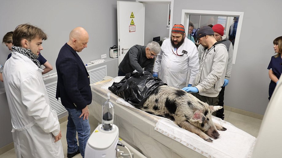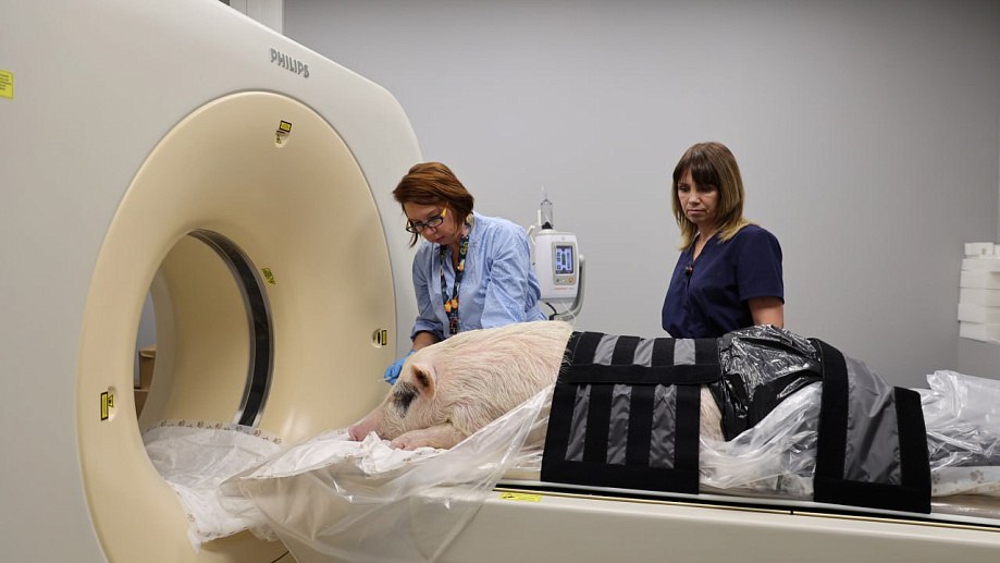 Это произошло в НГУ, где находится единственный за Уралом томограф для научной работы с животными. В него поместили две свинки породы «Минисибс». Вес каждой — 80 кг, возраст — 2 года. Исследование продолжалось примерно по часу: учёные сканировали мини-пигам грудную клетку. Всё это время они были под наркозом.