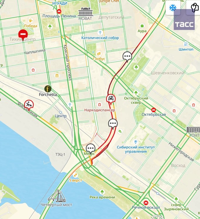Пробка образовалась после открытия проезда по четвертому мосту через Обь в Новосибирске, передает корреспондент ТАСС.