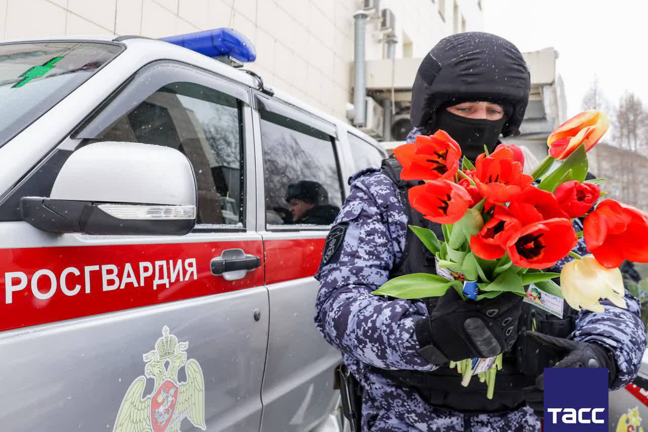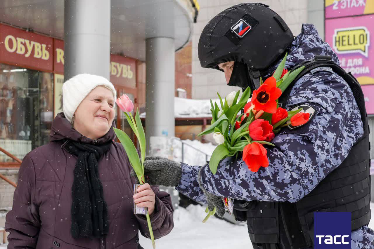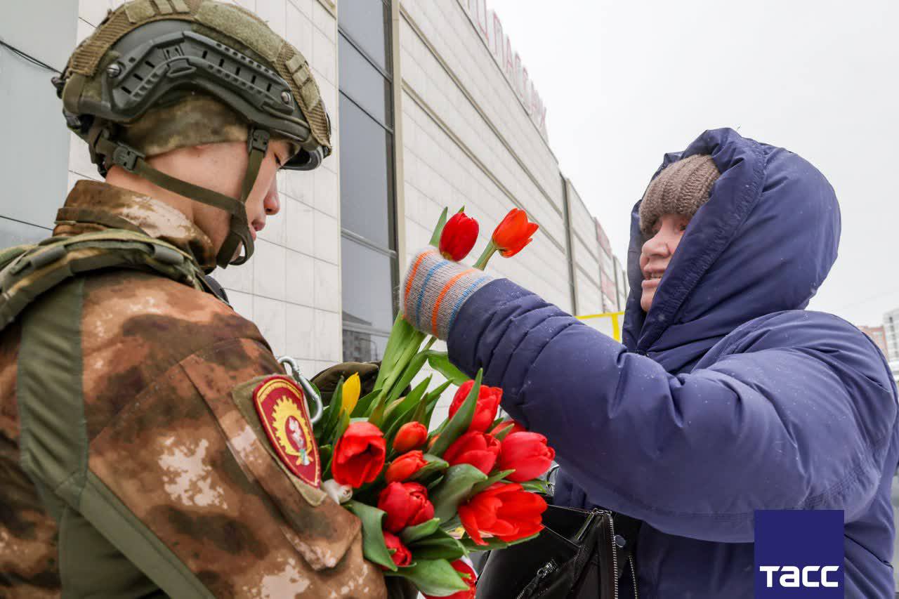 Сотрудники Росгвардии и курсанты военного института поздравили жительниц Новосибирска с предстоящим с 8 Марта.