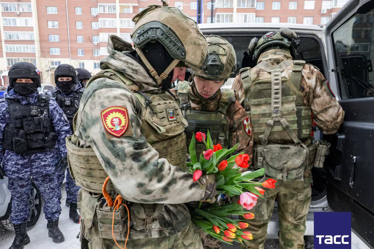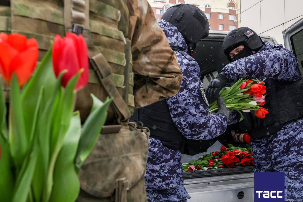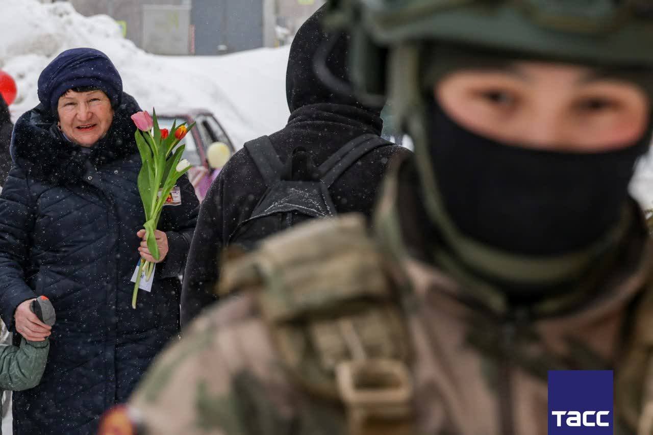 Сотрудники Росгвардии и курсанты военного института поздравили жительниц Новосибирска с предстоящим с 8 Марта.