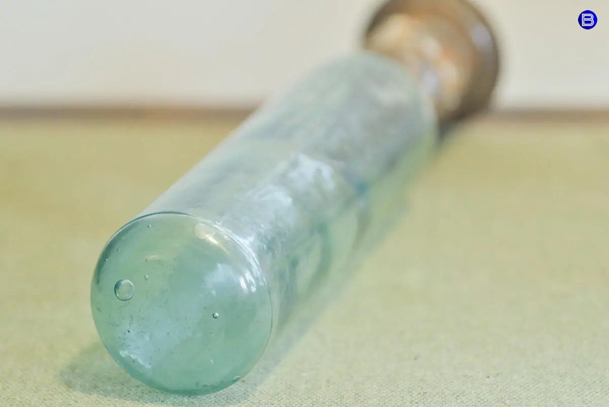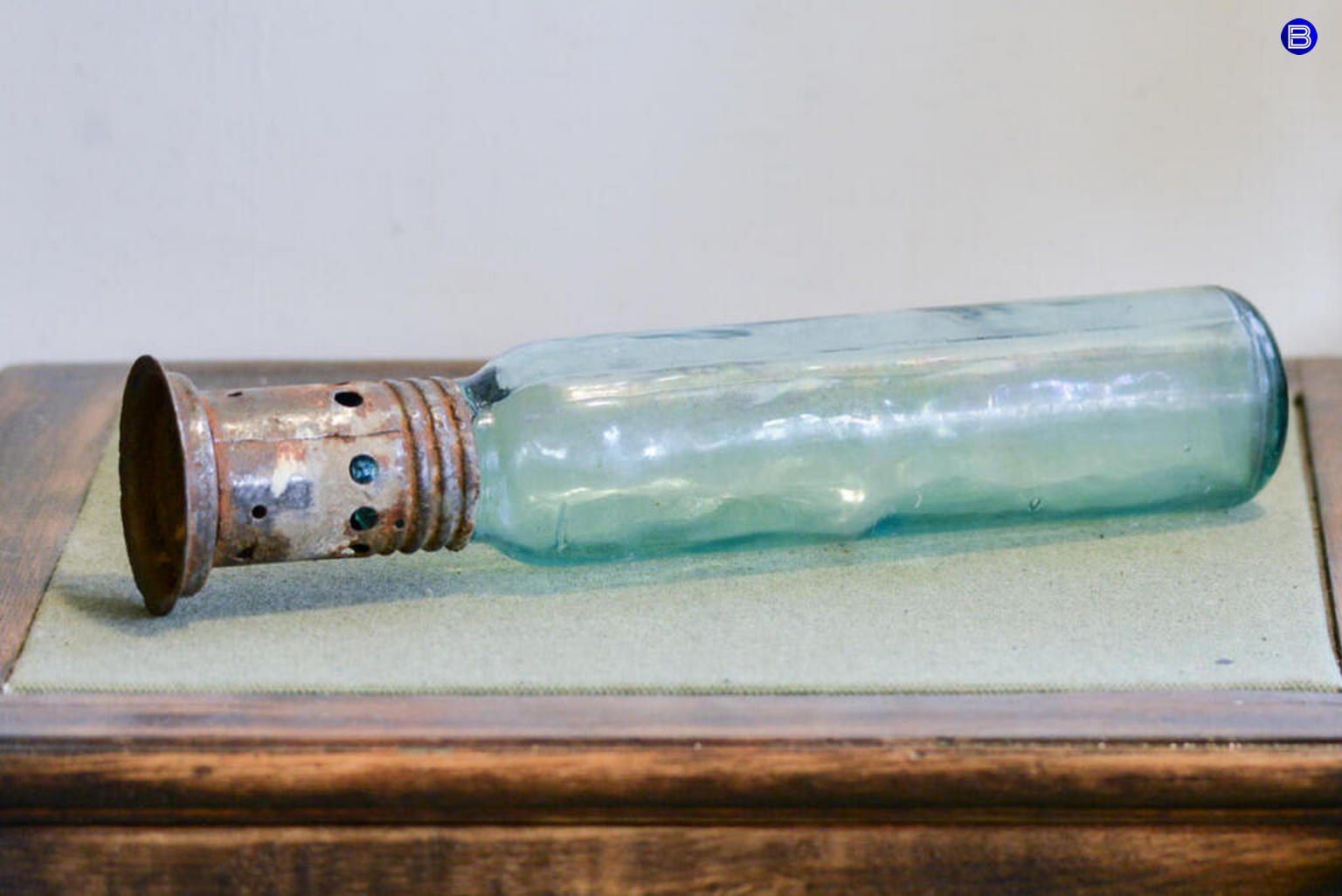 Оказалось, что это дореволюционный огнетушитель. Такие раньше использовали как ручные гранаты во время пожара. В колбе был газ тетрахлоруглерод.