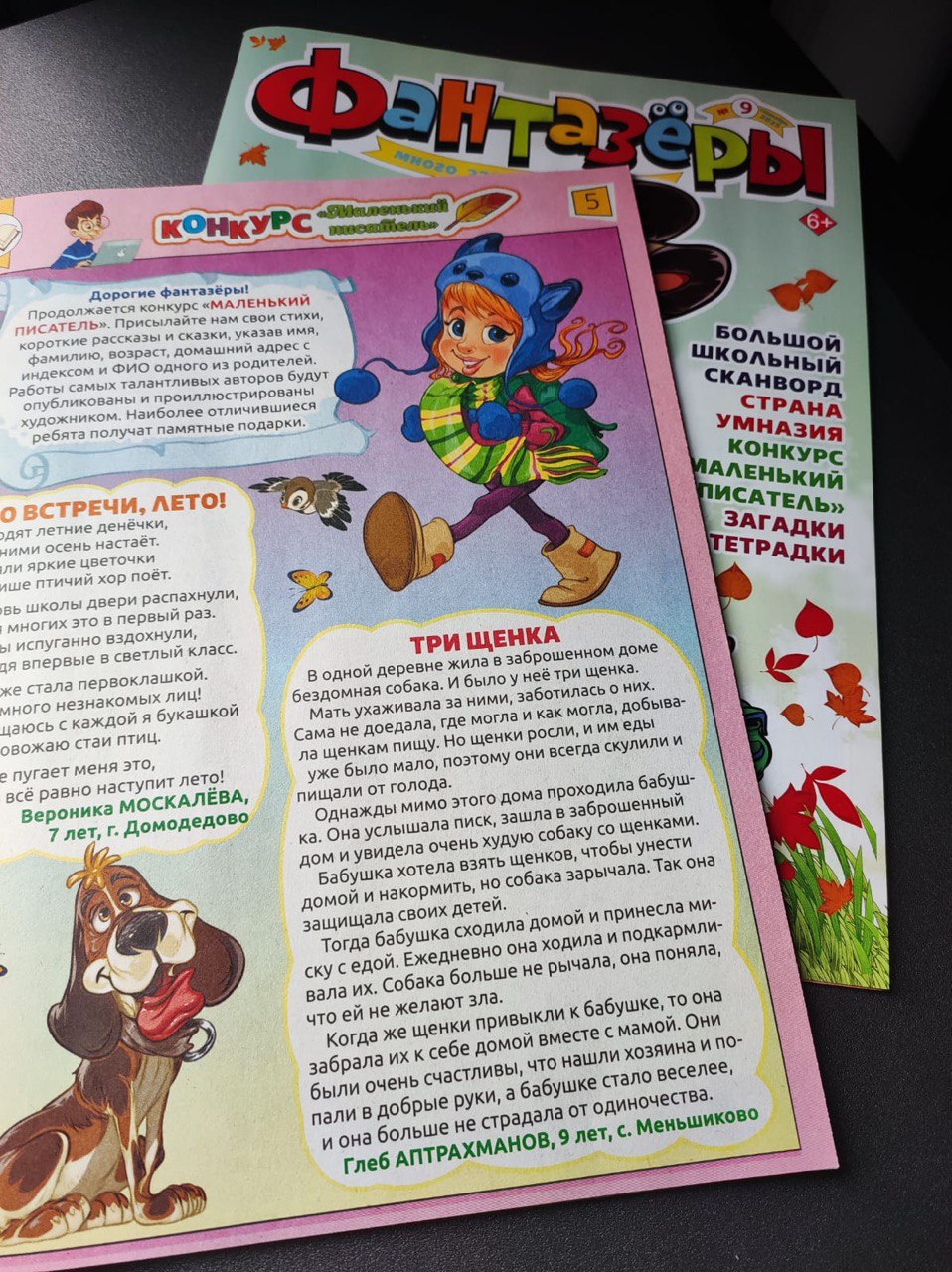 Девятилетний Глеб Аптрахманов из маленькой школы в селе Меньшиково дебютировал в журнале «Фантазёры» со своим рассказом «Три щенка», благодаря благотворительному проекту «Книга для Тёмы». Мы уже писали, что наши друзья и партнеры проекта издательство ЮНИЛАЙН будут публиковать не вошедшие в книгу истории в одном из своих журналов. Редакция журнала, отметила работу Глеба и опубликовала её в рубрике «Маленький писатель».