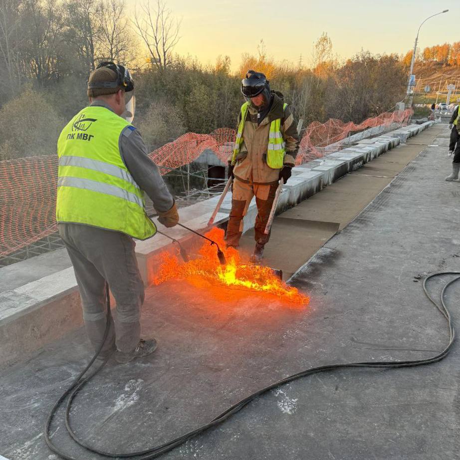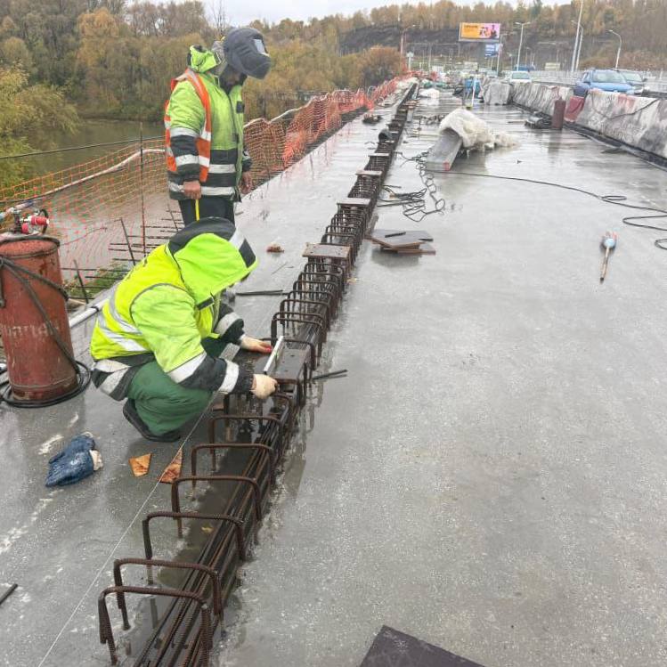 На мосту через реку Иню на Бердском шоссе приступили к установке барьерных ограждений. Уже уложены монолитные плиты, идёт бетонирование цоколя и устройство гидроизоляции проезжей части.