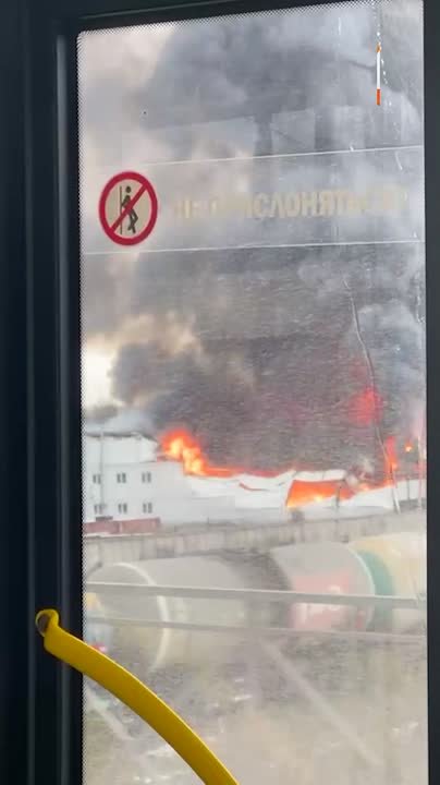 На кадрах видно масштаб возгорания — языки пламени охватили склад, над ним возвышается столб дыма.