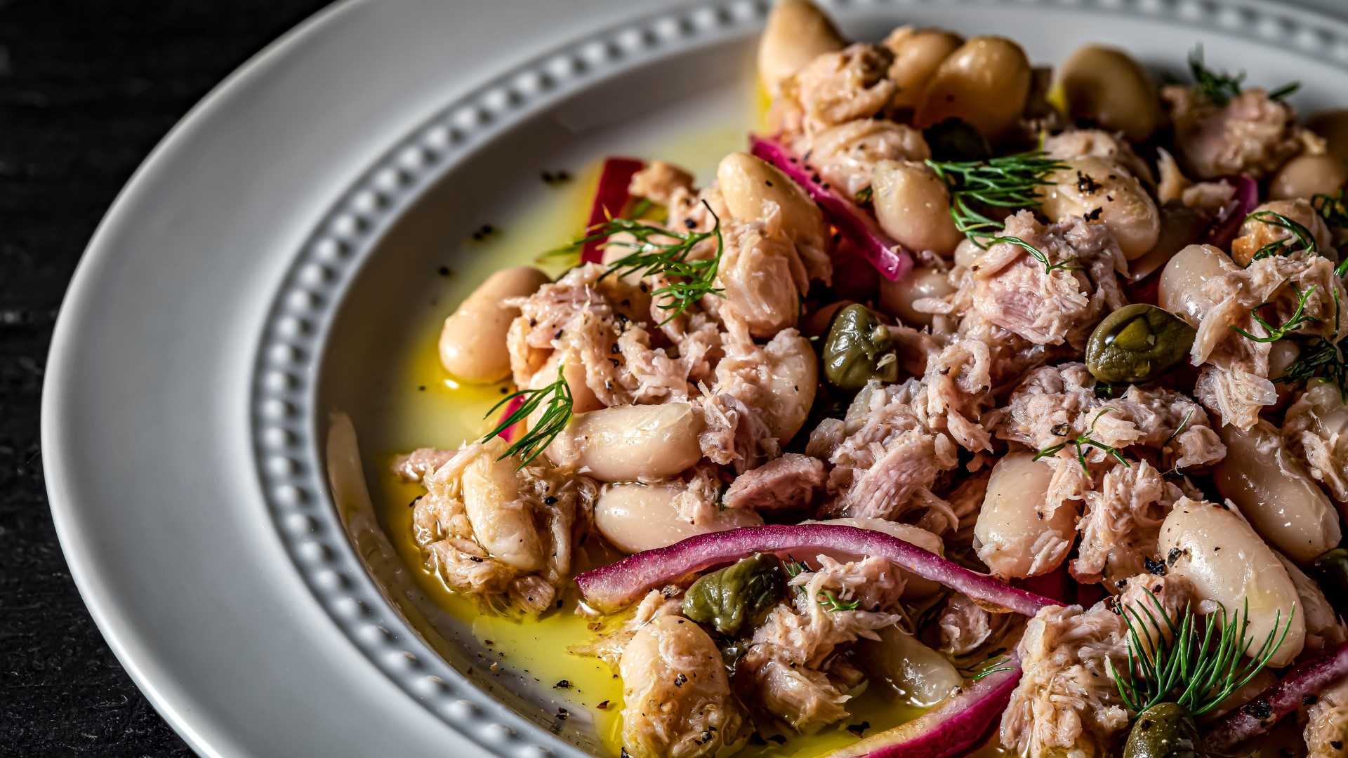 Поделите черри на половинки, нарежьте оливки кружочкам, а лук — полукольцами. Не забудьте измельчить зелень. Слейте жидкость из банок с консервами и разомните рыбу вилкой.