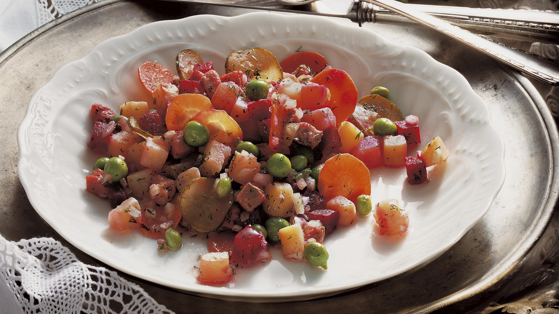 В Советском Союзе был распространен совершенно другой рецепт винегрета. Благодаря необычным ингредиентам блюдо получалось необычайно сытным. В салат хозяйки добавляли не квашеную капусту, а самую обыкновенную тушенку. А заправляли блюдо майонезом и горчицей.