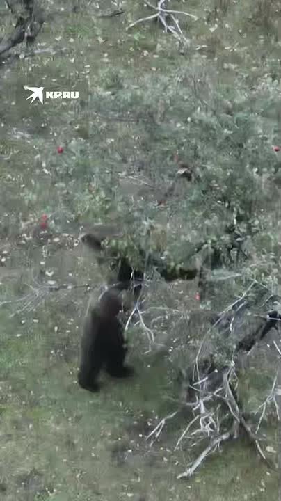Медведь ловко собирает яблоки в Алтайском заповеднике