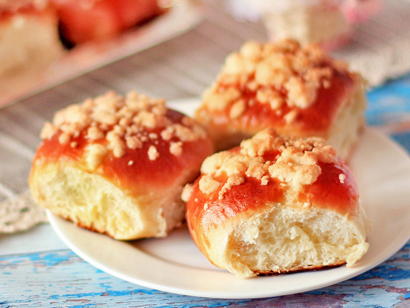 Выложите булочки на противень швом вниз и оставьте увеличиться в объеме на 30 минут. Затем смажьте взбитым яйцом и посыпьте штрейзелем. Выпекайте в предварительно разогретой до 180°C духовке в течение 20–25 минут до золотистой корочки. Дайте остыть перед подачей.