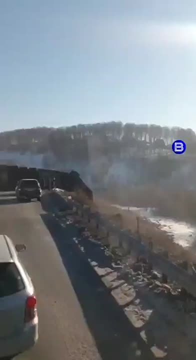 Тяжёлый грузовик упал на бок, пробил ограждение на путепроводе и повис на краю.
