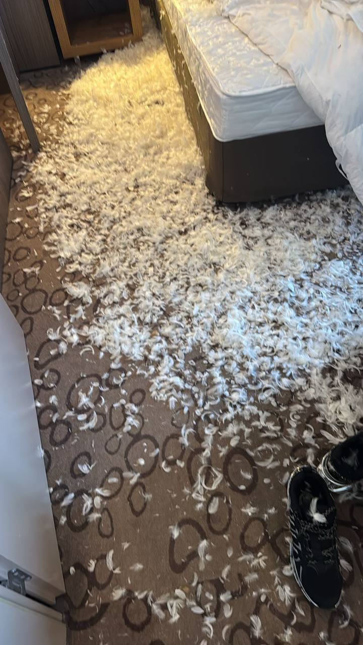 «За секунду мой номер и я сам покрылись толстым слоем перьев. Пришлось вызывать горничную, которая всю ночь убирала гостиничный номер. Уже утром, после бессонной ночи, я был вынужден заплатить отелю кругленькую сумму за причиненный ущерб», — сказал он.