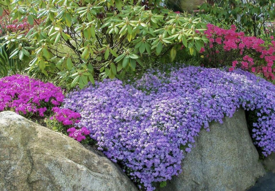 - Флокс шиловидный - высота 10-15 см. Яркие цветные подушки этого растения цветут с мая по июнь, любят солнечные места.