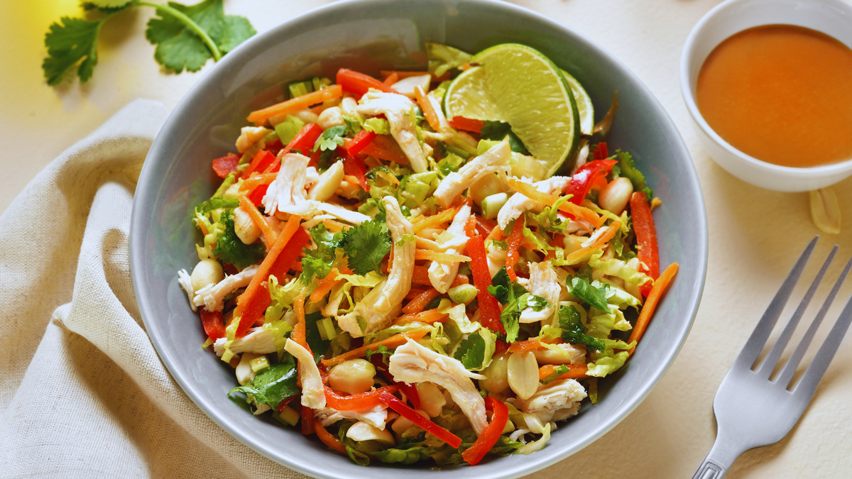 Шаг 2: Создание салата. В большой салатнице смешать листовой салат, капусту, курицу, болгарский перец, морковь и зеленый лук. Добавить кинзу и орехи. Поражая своими цветами и текстурами, этот салат привлекает к себе внимание.
