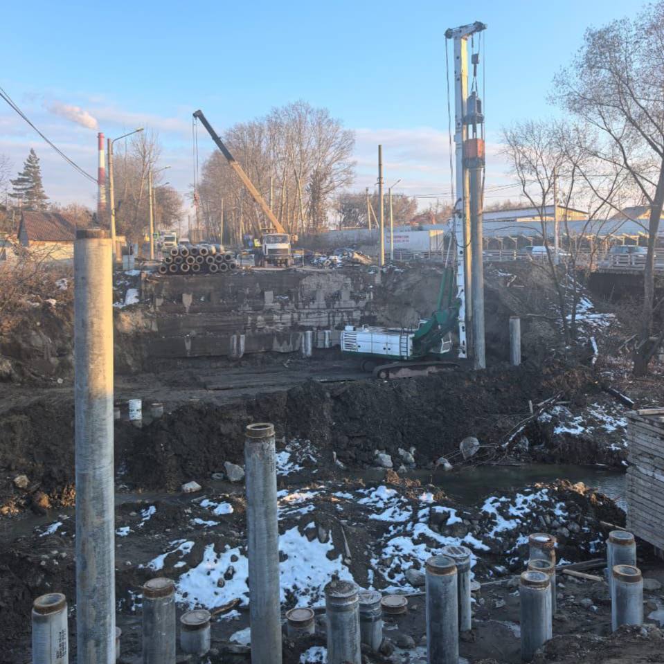 На улице Петухова продолжается капитальный ремонт моста через реку Тула. Подрядчик завершил испытания первых свай — они успешно прошли проверку на прочность. Сейчас продолжается погружение свай для новых опор моста.