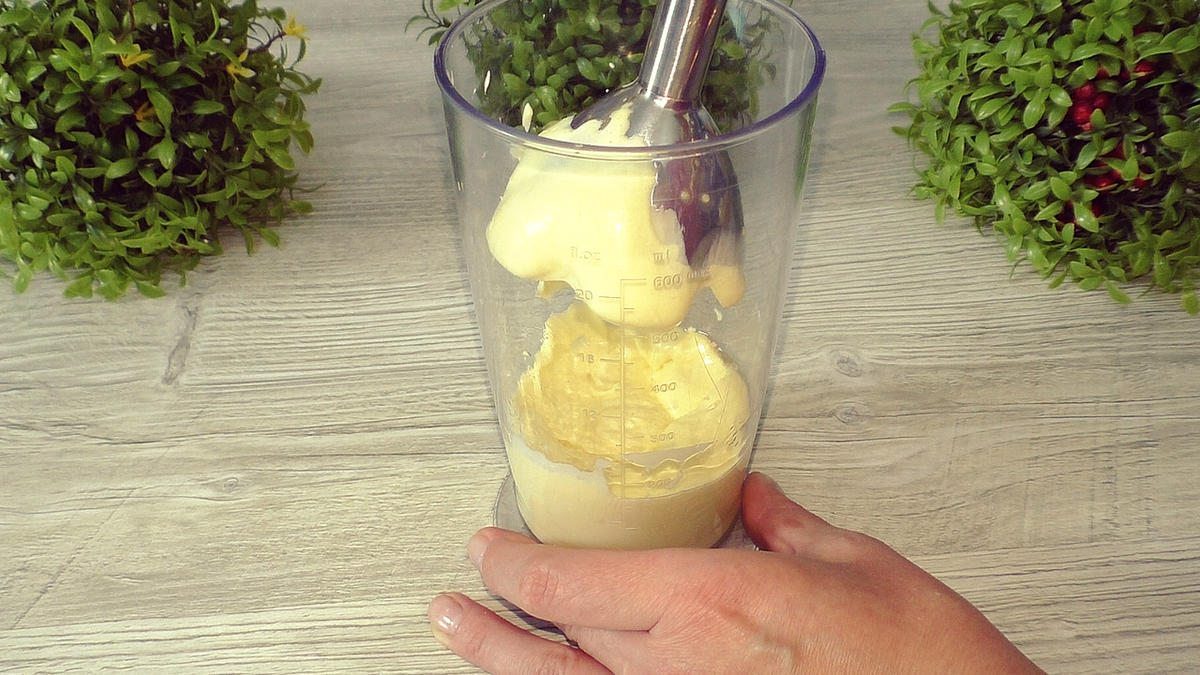 Первый шаг включает в себя подготовку эмульсии. В чашу блендера нужно поместить растительное масло и одно яйцо. Затем стоит включить блендер и перемешивать массу, не поднимая его, до получения однородной субстанции, напоминающей майонез. Этот способ позволяет избежать лишнего запаха масла в готовом пироге.