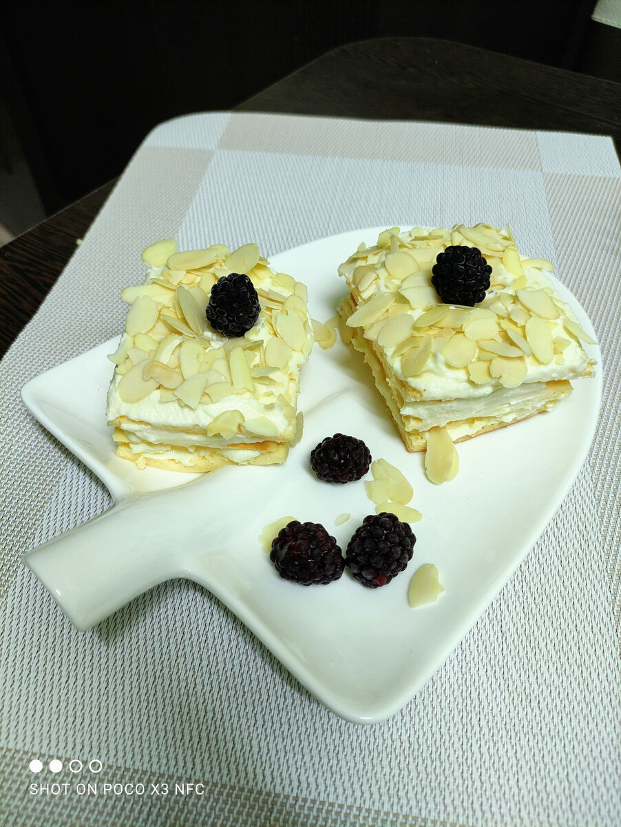 Осторожно снимите бисквит с пергамента, подровняйте края ножом и нарежьте на 8 равных прямоугольников. Получится два пирожных по 4 коржика в каждом. Каждый коржик обильно смажьте кремом и сложите друг на друга. Верхний слой также украсьте кремом.