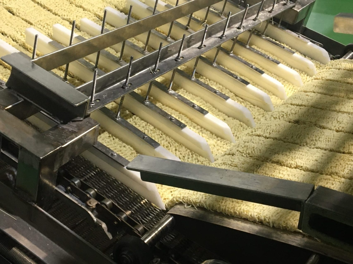 Затем полуфабрикат попадает во фритюрную камеру, где обжаривается в растительном масле. Этот процесс не только избавляет лапшу от лишней влаги, но и превращает её в хрустящие брикеты, которые могут храниться месяцы без консервантов. Обжарка также делает лапшу более пористой, что помогает ей быстро впитывать воду при заваривании.