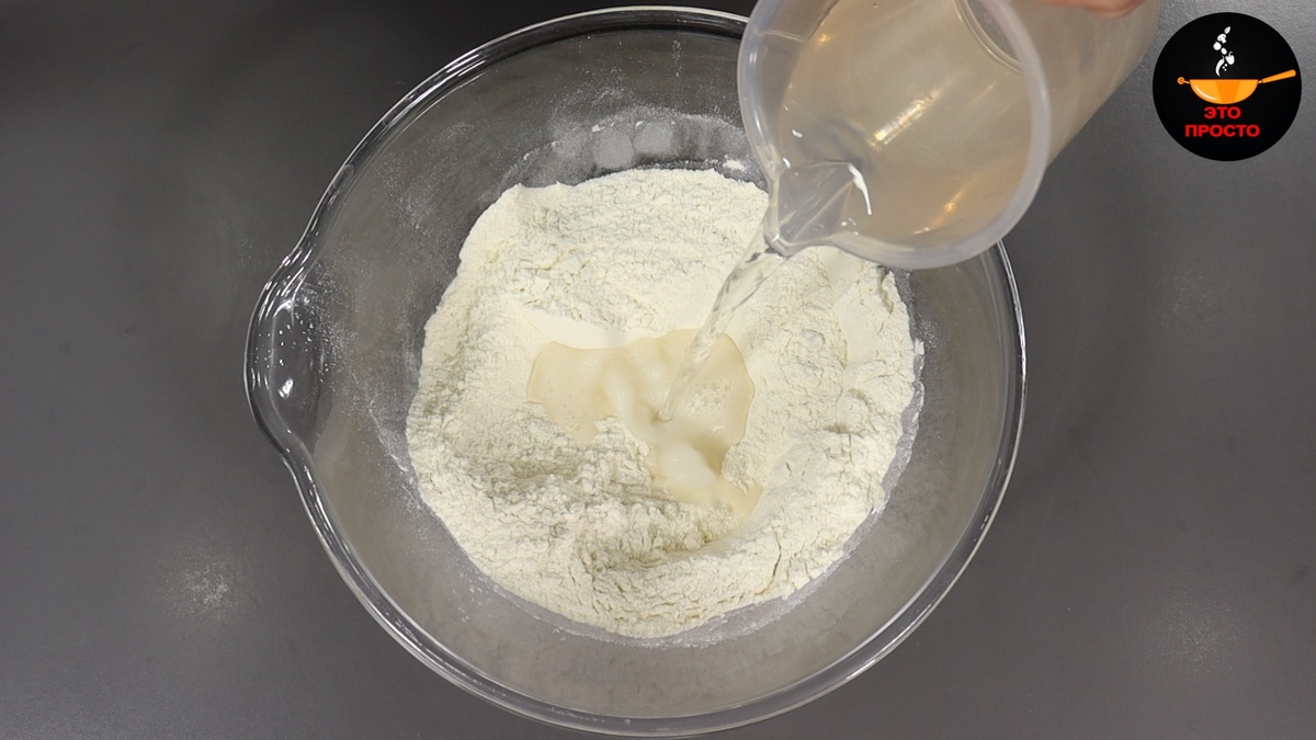 Для начала, в просторной миске соединяются 450 г просеянной муки, 8 г соли и дрожжи. Далее добавляется 360 мл горячей воды — основное правило: вода не должна превышать 50°C, чтобы не убить дрожжи. На ощупь она должна быть просто горячей, но не обжигающей.