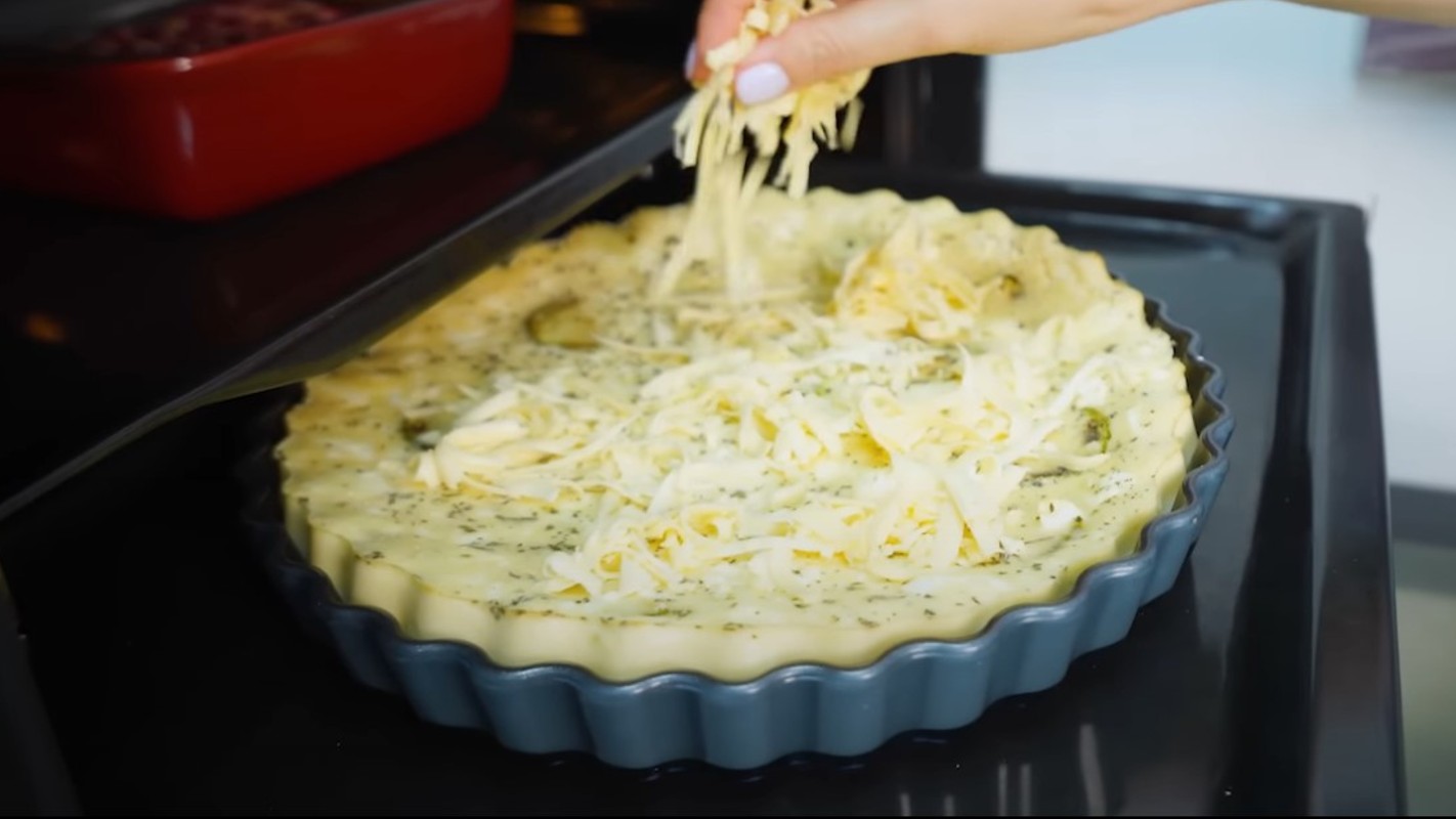 Для теста понадобится тщательно смешать все ингредиенты. Получившейся массой аккуратно залить кабачки, чтобы они не всплыли. Поставить в духовку.