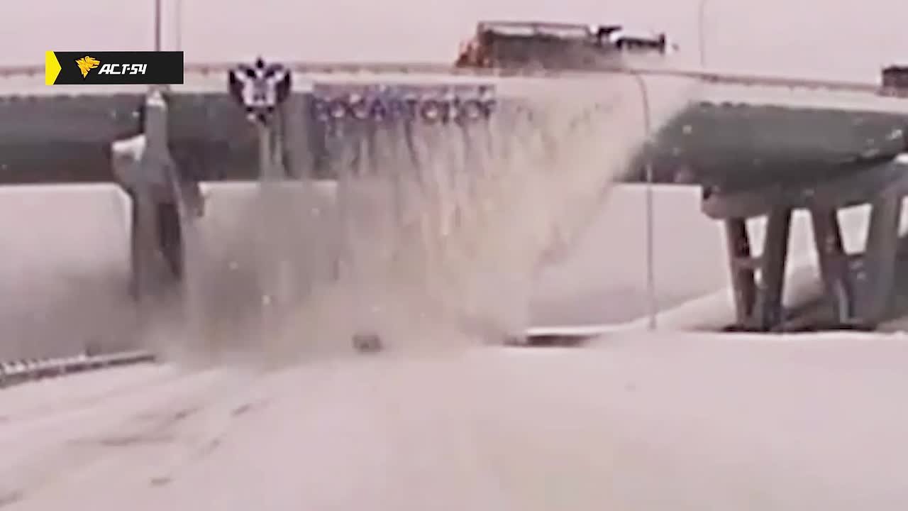 Упс... Снегоуборщик завалил снегом и грязной жижей машину, проезжающую под развязкой на Восточном обходе Новосибирска...