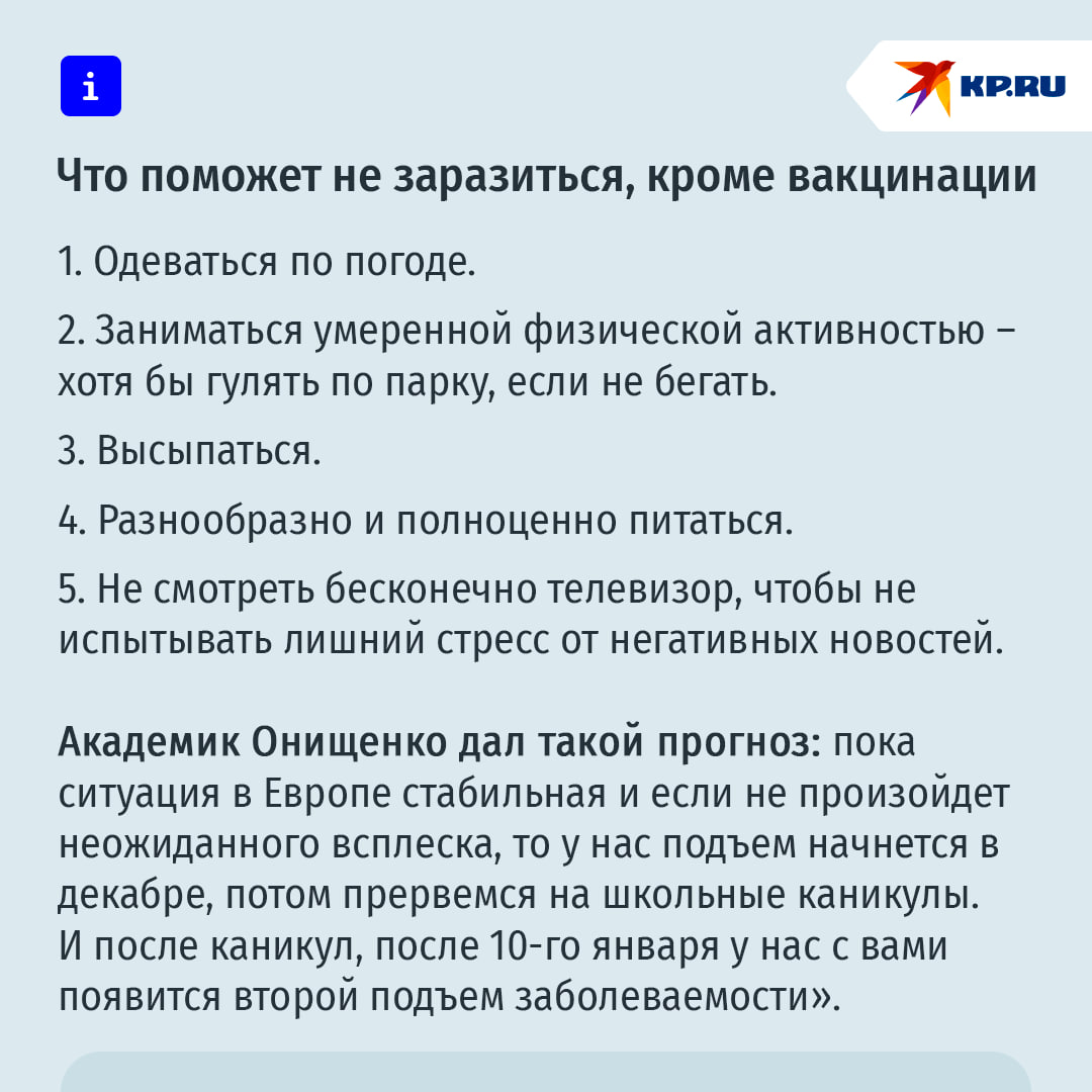 "Сейчас серьезных вспышек заболеваемости нет, эпидпороги не превышены. По подсчетам, сейчас 44 больных на 10 тыс. населения. Значит, на 46% ниже той базовой линии, которая есть для данного периода. Причем циркулируют тоже спрогнозированные вирусы того же гриппа, которые у нас включены в прививку. В этом году довольно агрессивно ведут себя РС-вирусы (респираторно-синтициальные). Хотя на сегодняшний день их всего 0,4% в общей массе, но они более опасны. По сингапурским данным, летальность при рс-вирусной инфекции – до 5% (при ковиде у нас было 2%)".