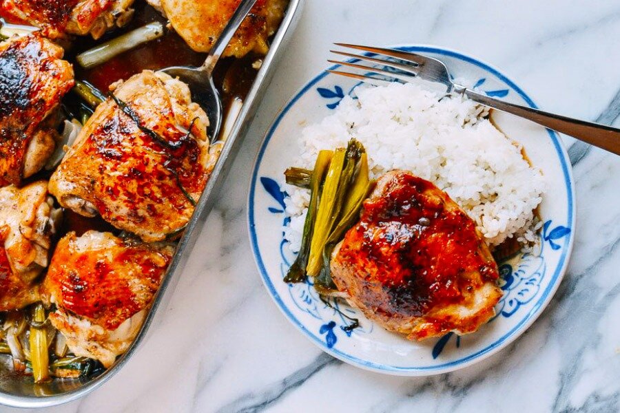 Выложите куриные бедрышки в форму кожей вниз и обжарьте по несколько минут с каждой стороны до золотистой корочки. Затем добавьте нарезанный зеленый лук и щедро полейте приготовленным соусом.