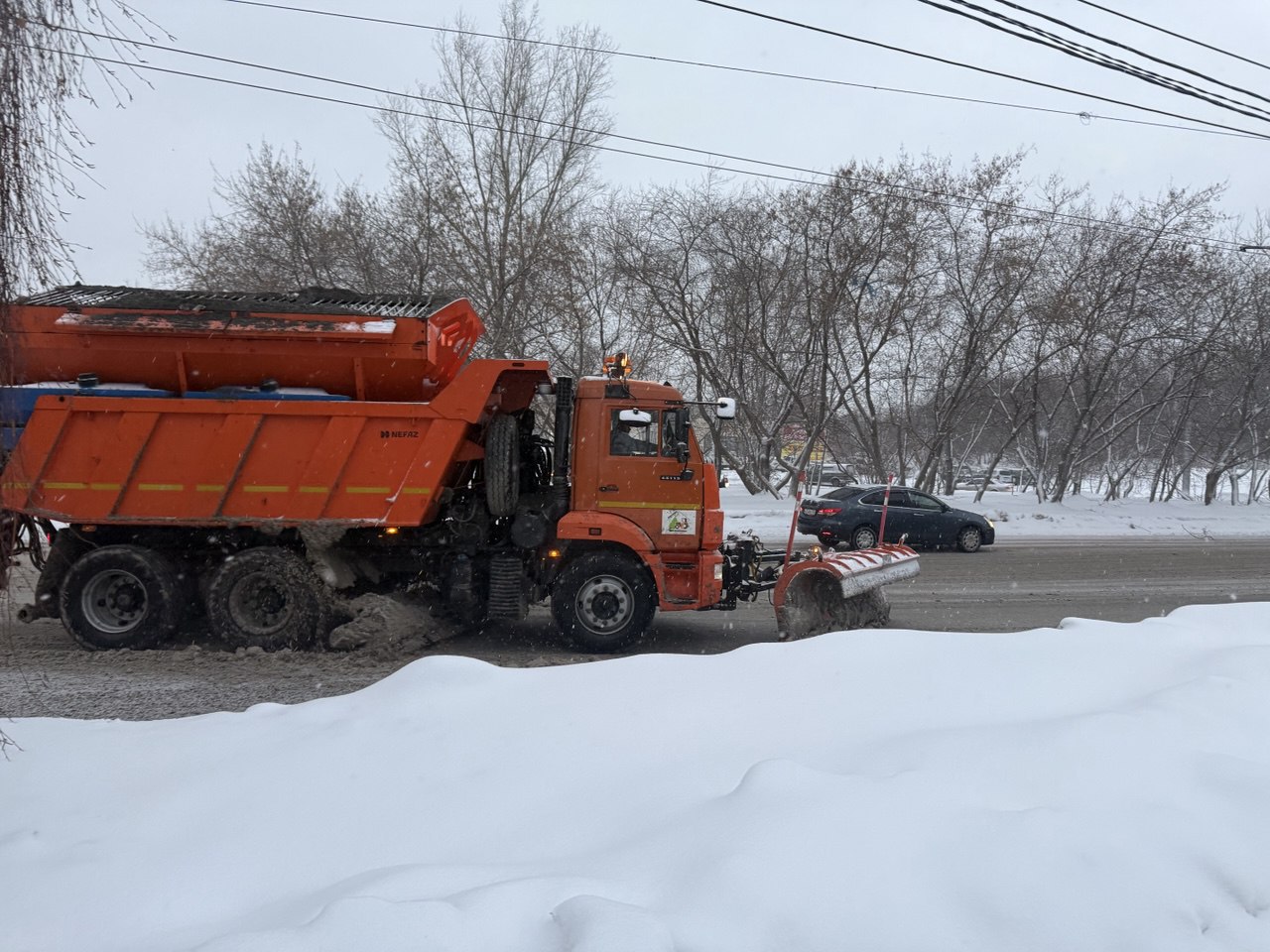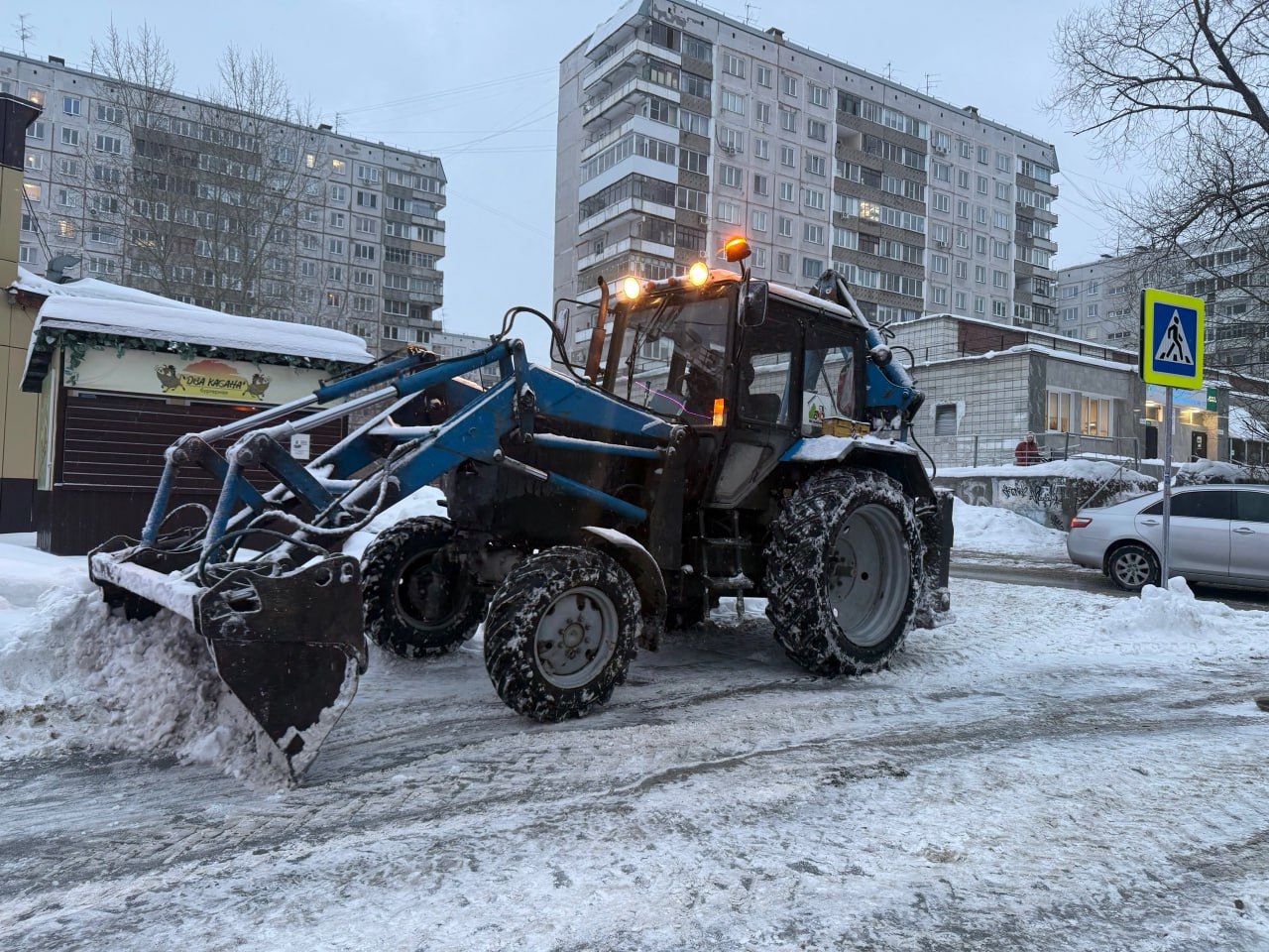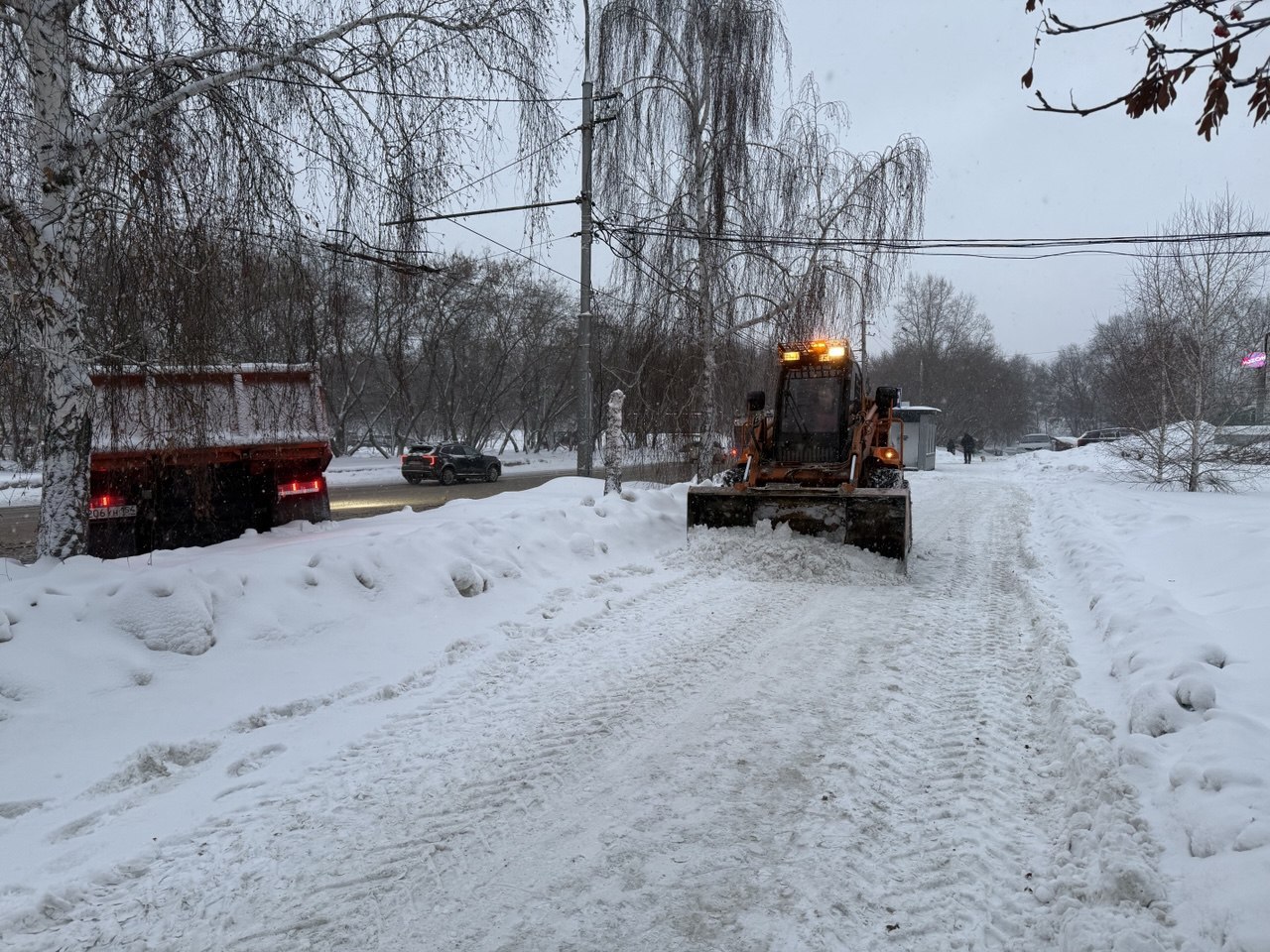 В уборке были задействованы фронтальный погрузчик, два самосвала, комплекс комбинированных дорожных машин, трактор и трое дорожных рабочих.