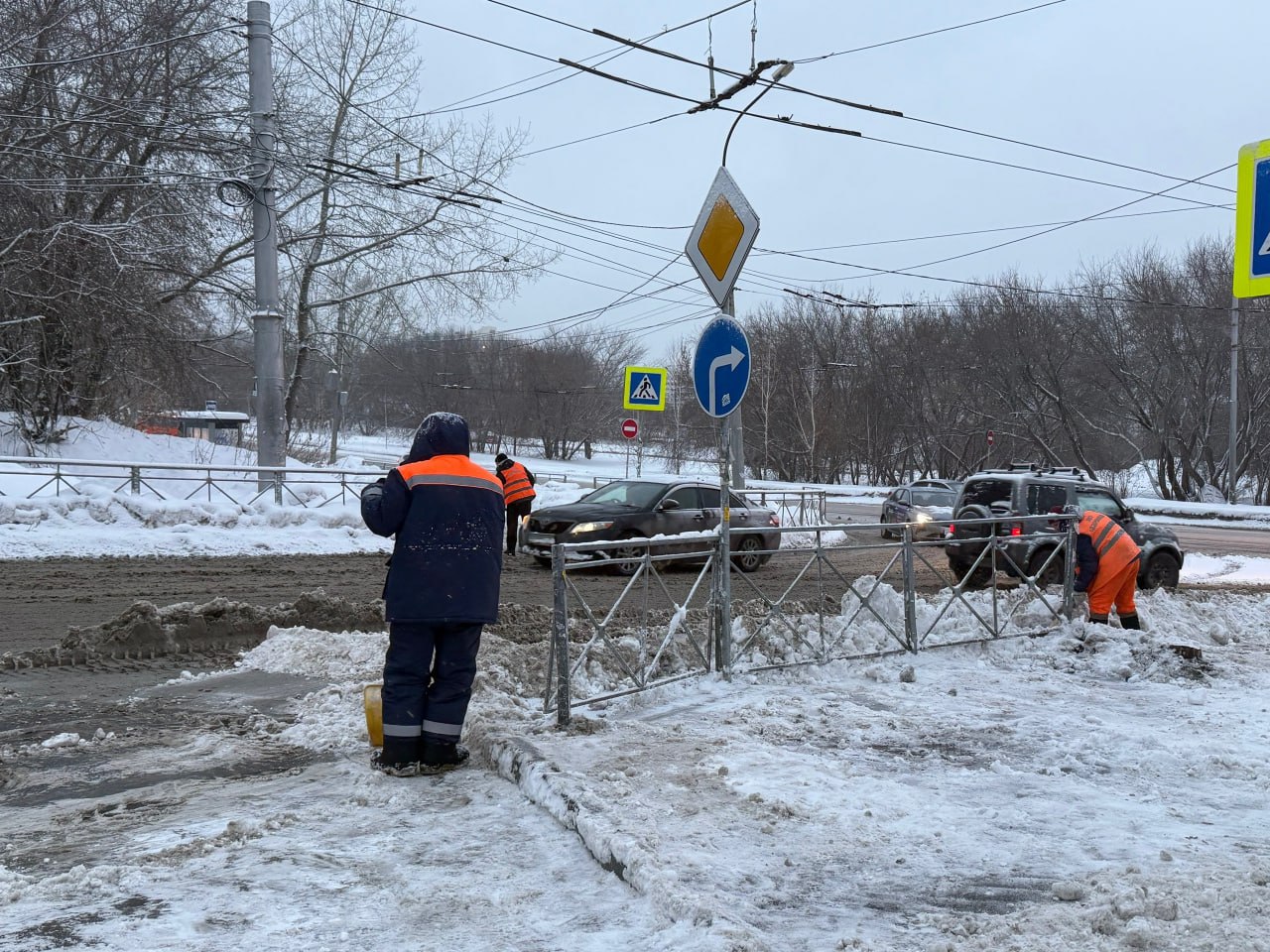 Сегодня в Дзержинском районе на пересечении улиц Доватора и Бориса Богаткова у городской поликлиники № 17 почистили и вывезли снег.