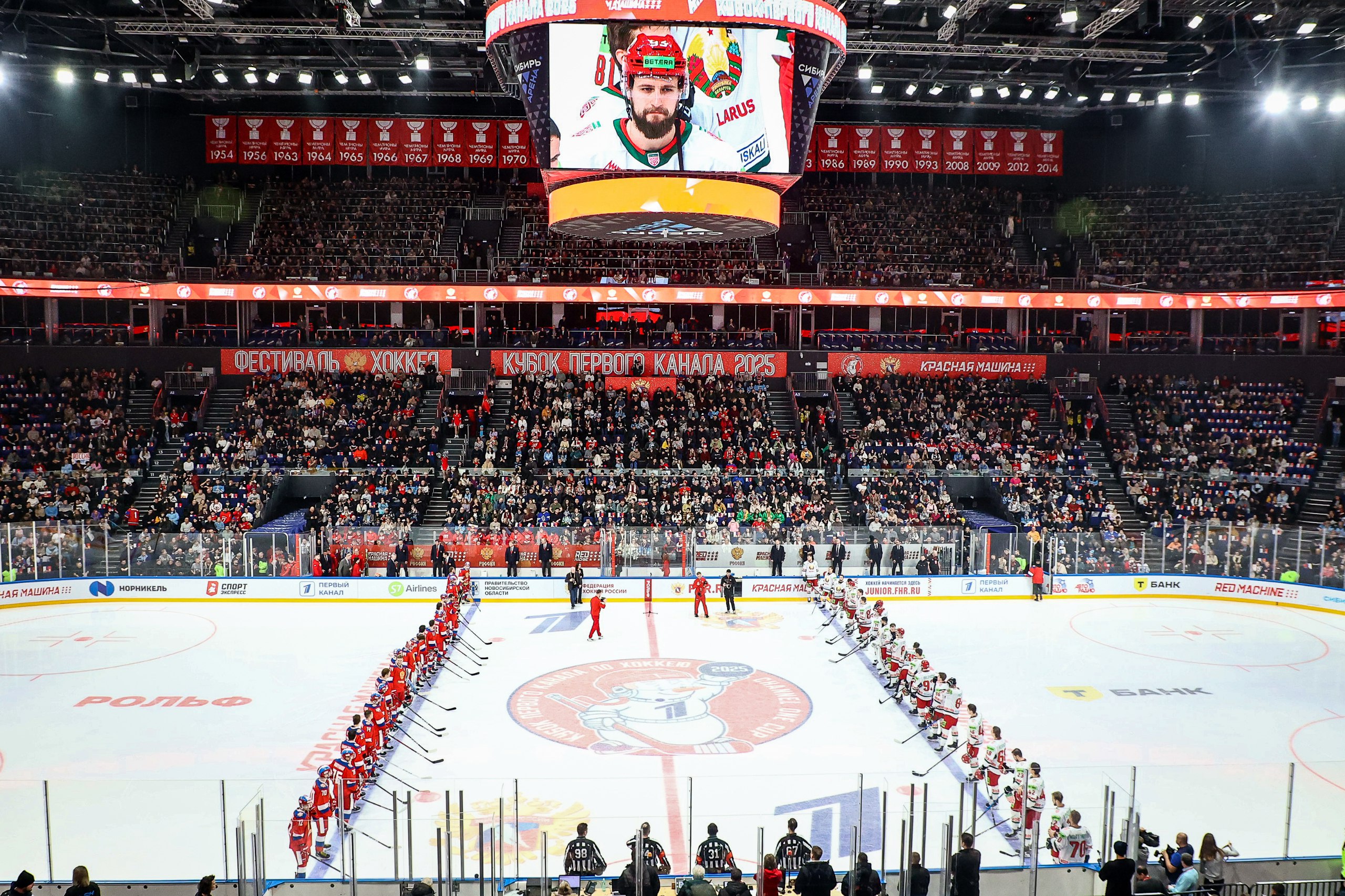 Сборная РФ по хоккею одержала убедительную победу над соперниками из Беларуси на Кубке Первого канала. Матч в Сибирь-Арене закончился со счётом 3:1. По подсчётам ФХР, в этот вечер на трибунах новосибирского ЛДС собралось 11 650 зрителей. Голами в составе российской команды отметились Роман Канцеров, Роман Горбунов и Данил Аймурзин (дважды).