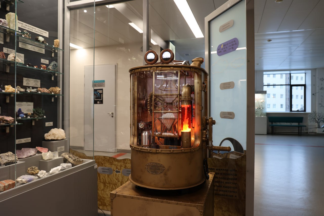 Внутри устройства, выполненного в стиле стимпанк, симулируются природные процессы, которые приводят к образованию минералов. Кроме того, экспонат воспроизводит фрагменты речи Эйнштейна и основателя новосибирского Академгородка Лаврентьева.