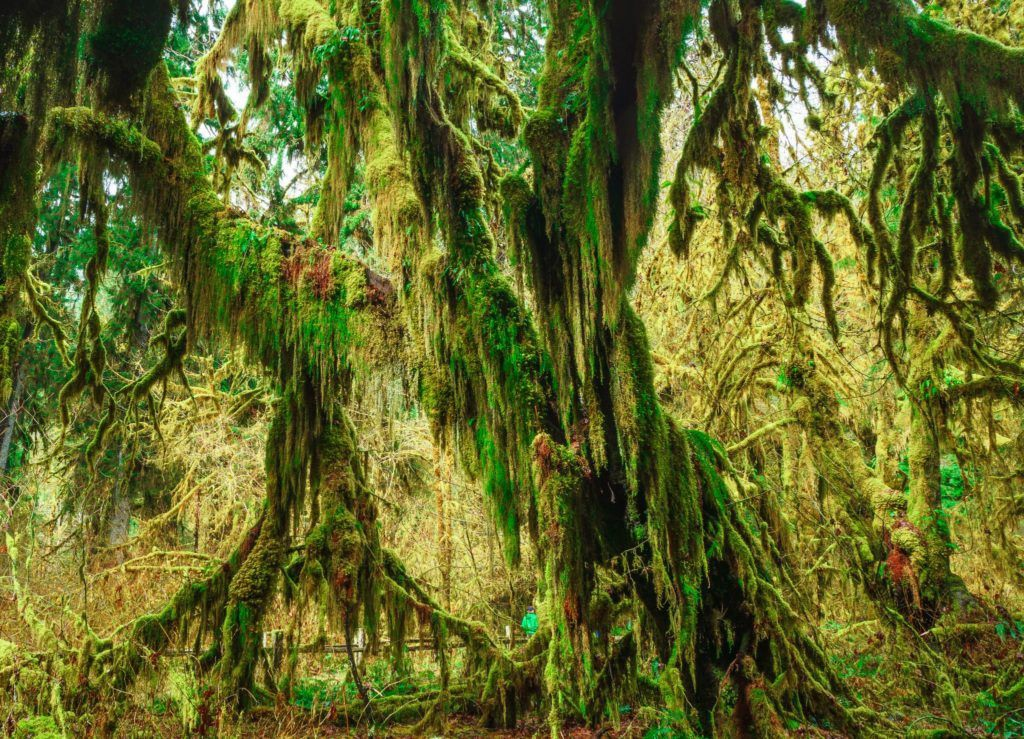 Пожалуй, самое волшебное место в американском штате Вашингтон - это дождевой лес в национальном парке «Олимпик», расположенный в живописной долине реки Квинлот. Этот лес наполнен сказочной зеленью, где высокая влажность и частые дожди создают идеальные условия для обитания бесчисленных мхов и лишайников. Они окутывают деревья, камни и тропинки, создавая поистине магическую атмосферу.